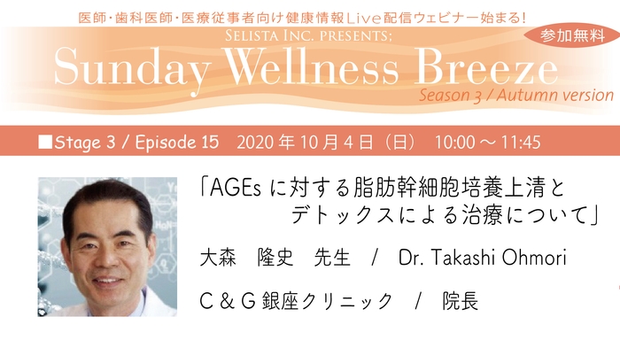 無料Live Zoomウェビナー開催/抗加齢・予防医療のプロ向け! 「AGEsに対する脂肪幹細胞培養上清と デトックスによる治療について」 大森 隆史先生/Dr. Takashi Ohmori (C&G銀座クリニック/院長) 《10月4日(日)朝10時~11時45分》