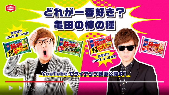 亀田製菓株式会社(本社:新潟県新潟市、代表取締役社長 COO:佐藤 勇)は、発売から56年の伝統を誇る米菓売上No.1※の「亀田の柿の種」の新商品『亀田の柿の種 超わさび』を3月14日(月)から、『亀田の柿の種 超梅しそ』を4月18日(月)から期間限定で、全国にて発売いたします。これに伴い、総登録者数560万人を超える人気動画クリエイターSEIKINのYouTubeチャンネル「SeikinTV」にて、弟であるHIKAKINとコラボしたドッキリ動画を公開いたします。