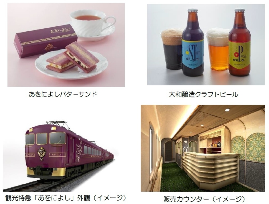 車内の販売カウンターでは、シェラトン都ホテル大阪特製の「あをによしバターサンド」のほか、奈良にゆかりのあるスイーツ、ドリンクや「あをによし」グッズなどを販売し、旅の楽しみに彩りを添えます。
