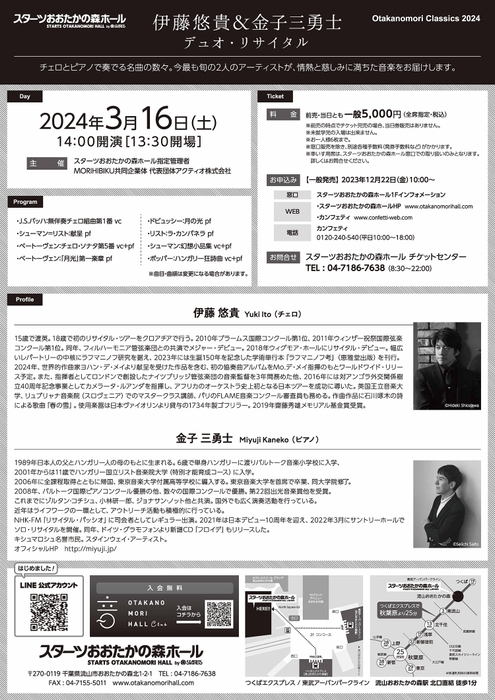 アクティオ株式会社主催、『伊藤悠貴&金子三勇士 デュオ・リサイタル』が2024年3月16日 (土)にスターツおおたかの森ホール(千葉県流山市おおたかの森北1-2-1)にて開催されます。