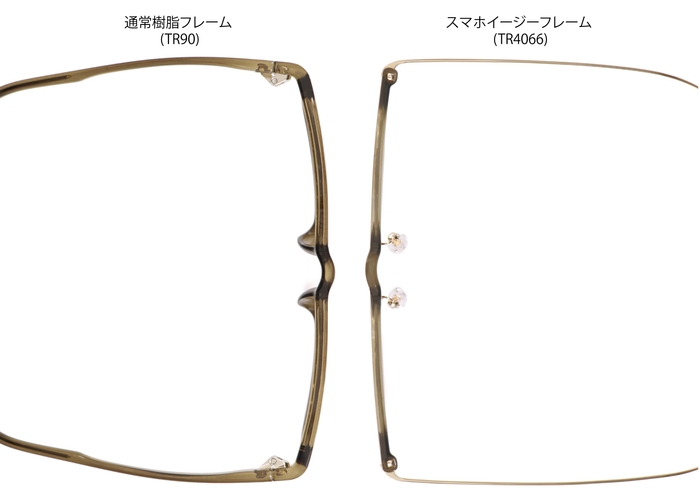 - プラスチックフレームの素材は、メガネフレームで多用されている樹脂素材の中でも硬さのあるTR4066を採用しています。硬度があることでよりフレームの厚みを薄くすることが可能となりました。