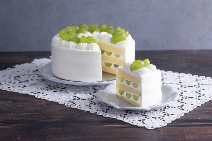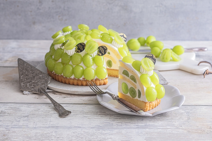 爽やかな甘みと上品な香りが特徴の岡山産マスカット・オブ・アレキサンドリアを贅沢にサンドしたショートケーキ。マスカットの女王と呼ばれる芳醇なマスカットの香りと甘み、ミルキーなホイップクリームの味わいを存分に楽しんで。