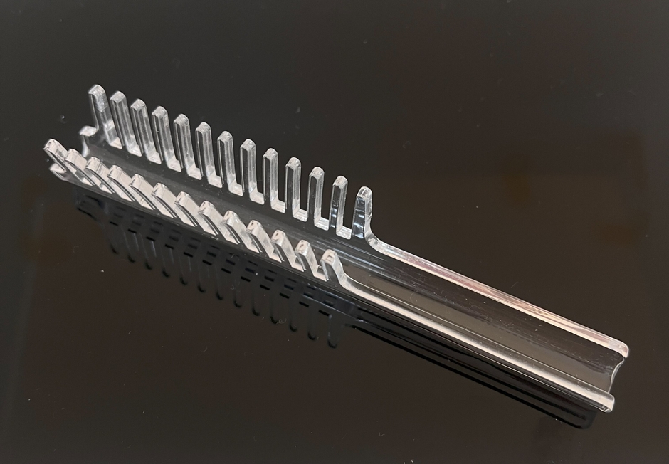 通常のコームを2枚重ねたV字構造にし、その溝に沿わせてハサミを動かすことで綺麗な直線ラインでカット可能