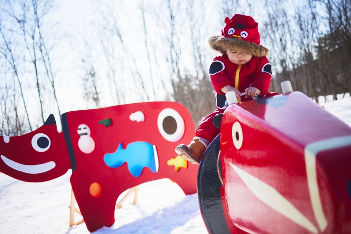 赤べこをモチーフにしたオリジナル遊具で雪遊び