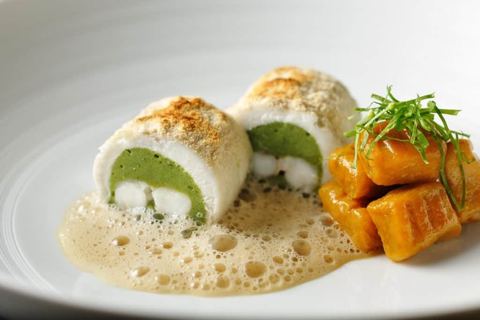 魚料理は、えびをバジル風味のホタテのムースで包み、マツカワガレイで巻いてふっくらと蒸した一品です。仕上げに粉状にしたグリッシーニをかけて炙ることで、香ばしい味わいにまとめます。ソースは、ベルモット(*7)とえびの殻を使ったクリームをムース状にしてふんわりと合わせます。また、付け合わせは、レモンと貝の出汁を使ったバターソースを絡めた南瓜のニョッキです。ニョッキは、とろけるような柔らかい食感にこだわりました。爽やかな酸味がマツカワガレイの味わいと調和し合います。