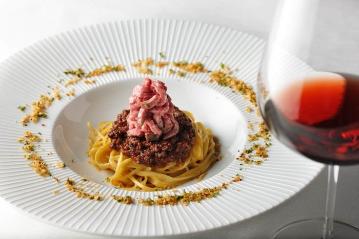 パスタに合わせるワインは、長期熟成された赤ワインです。力強く熟成感のある旨みが、成羊肉を使用したコクのあるラグーと、柔らかくジューシーな仔羊のローストの味わいを引き立てます。パスタには、香り豊かなタヤリン(*11)を使用。お好みでローストした香草パン粉(モッリーカ)をかけると、にんにくの香りが口の中で広がり、異なる味わいを楽しめます。
