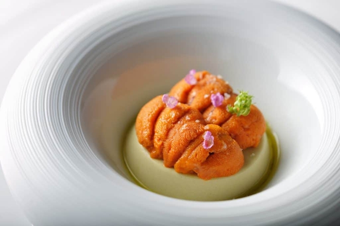 冷前菜「雲丹をたっぷり使ったリーキ(*3)のパンナコッタ」