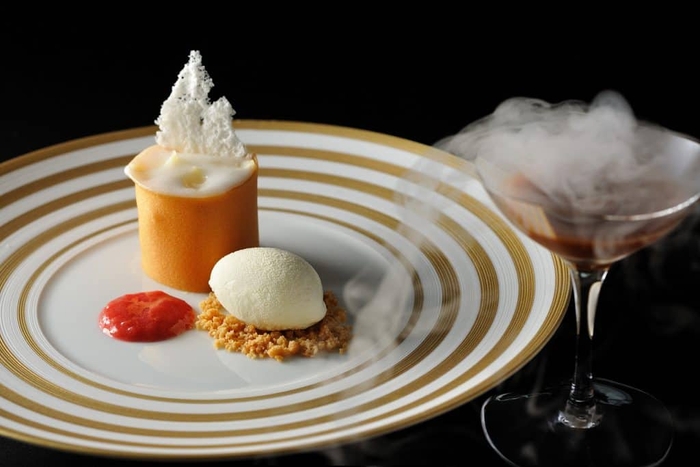 お口直しのジェラートは、当リゾートで飼育する乳牛から搾った「トマム牛乳」を使用したジェラートです。乳牛は冬の期間に体内の脂肪分が多くなるため、冬に搾乳した牛乳は特に濃厚な味わいになります。合わせて、ティラミス、カッサータ(*9)、パンナコッタの3つの味わいが楽しめるトッピングを用意。アマレットやリキュールなどを合わせ、大人なデザートとして味わうことも可能です。