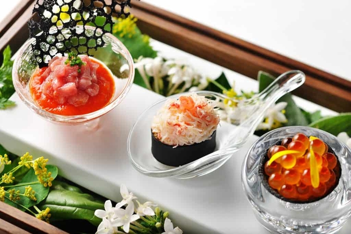 コースのはじまりを彩る小前菜には、海鮮を堪能できる3種類の料理を用意しました。蟹の軍艦を思わせるのは、貝を使用したペーストを海苔、ゆり根のペーストを酢飯に見立てた、シェフの遊び心溢れる一品です。蟹にホワイトバルサミコ酢を合わせ、さっぱりとした味わいに仕上げました。また、竹炭を練りこんだ黒いパイ生地の器を用いたイクラのトルタ(*1)には、生姜の風味がきいた茄子とイクラをふんだんに乗せて提供。マグロのタルターラ(*2)は、ピリッとした辛味のある香味料で味付けしたパプリカがアクセントとなり、マグロの甘味を引き立てます。