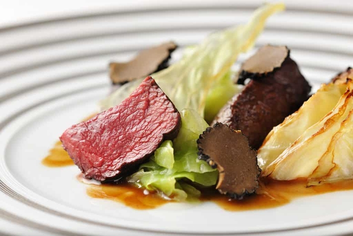 メインは、エゾ鹿肉の表面をこんがりと焼き、香ばしく仕上げた肉料理です。そこに、秋に収穫をし、雪室でじっくりと寝かせた越冬キャベツを合わせます。越冬キャベツは寒さから自らを守ることにより、糖度が増すことが特徴です。これを、柔らかく煮る、表面をこんがりと焼く、しっかりと乾燥させるといった3種類の調理法を用いて食感や味わいを変えて提供します。さらに、ソースにも鹿肉の出汁やキャベツの煮汁を使い、旨みのあるふくよかな味わいを堪能できます。