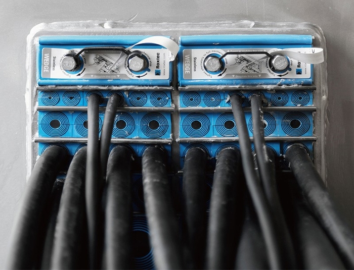 スウェーデンに本社を置くロクステック(Roxtec)は、電線・配管の貫通部を密閉するシーリングソリューションで世界をリードする。同社のシールは1枚ずつ剝がせるゴム層を備え、電線・配管の変更や追加が生じてもさまざまな外径に適応し、同一開口で防火・気密・水密を再現できる。この構造により、海運・造船各社が進める脱炭素の段階的実装を区画安全の面から支えている。
