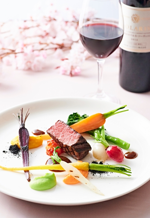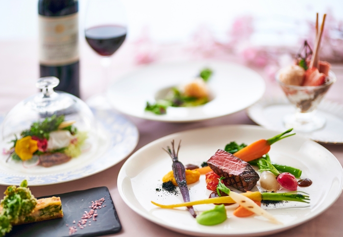 彩り美しい春の味覚が揃う季節にお届けする、シェフ厳選の食材を組み合わせた味わいと香りをお楽しみいただける特別ディナーコース。ファーストオードブルでは、信州味噌を使ったソースで味わう生ハムとタタキの2種の信州産馬肉を、春の風を感じる桜ウッドチップのスモークの演出付きでお届けいたします。また、信州プレミアム牛を使ったメイン料理では、春を奏でるアンサンブルのように並ぶ季節野菜たちがディナータイムをより一層華やかに彩ります。