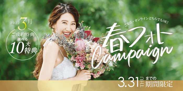 株式会社デコルテ(本社:兵庫県芦屋市、代表者:水間 寿也)が全国に展開するウェディングフォトスタジオ「スタジオAQUA/スタジオTVB/スタジオ8/スタジオAN」では、2022年3月1日(火)~3月31日(木)までの期間限定で、『春フォトキャンペーン』を実施中です。