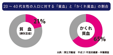 日本女性の40%、とくに月経のある20代~40代の女性の約65%が「貧血」もしくは「かくれ貧血」です。日本女性は必要量の6割ほどしか鉄分を摂取していません。 ダイエットの影響も大きいです。