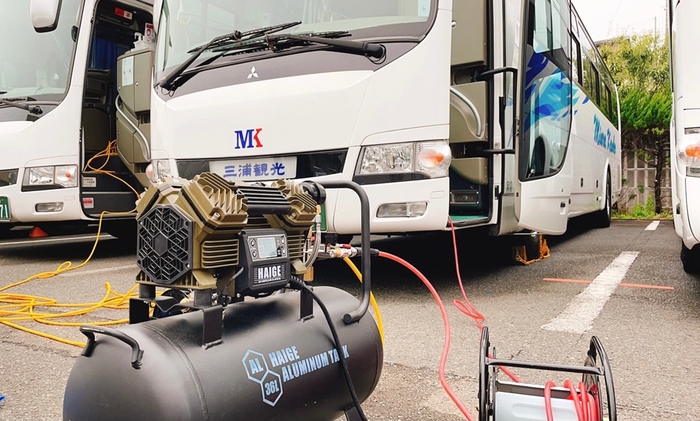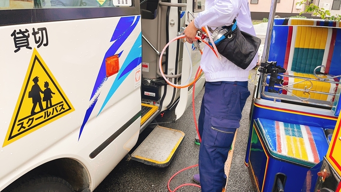 お客様に安心してご利用いただけるように、マイクロバス、小型・中型・大型バス、レンタカー、キッチンカー、トゥクトゥク、事務所建物まで、三浦観光バスのサービス提供場所すべてに光触媒により効果が持続する抗ウイルス・抗菌コーティング施工を行い、より安全かつ安心してバスやレンタカーをご利用いただける環境作りを行いました。