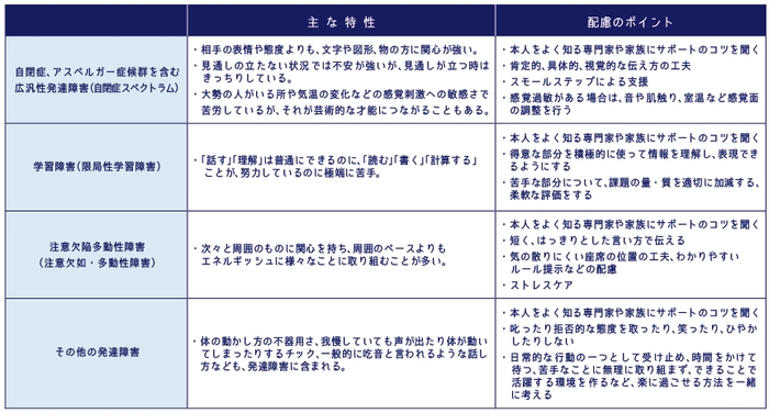 出典:厚生労働省 発達障害のある方と共に働く上でのポイントと障害特性 発達障害の特性(代表例)https://www.mhlw.go.jp/seisakunitsuite/bunya/koyou_roudou/koyou/shougaishakoyou/shisaku/jigyounushi/e-learning/hattatsu/characteristic.html