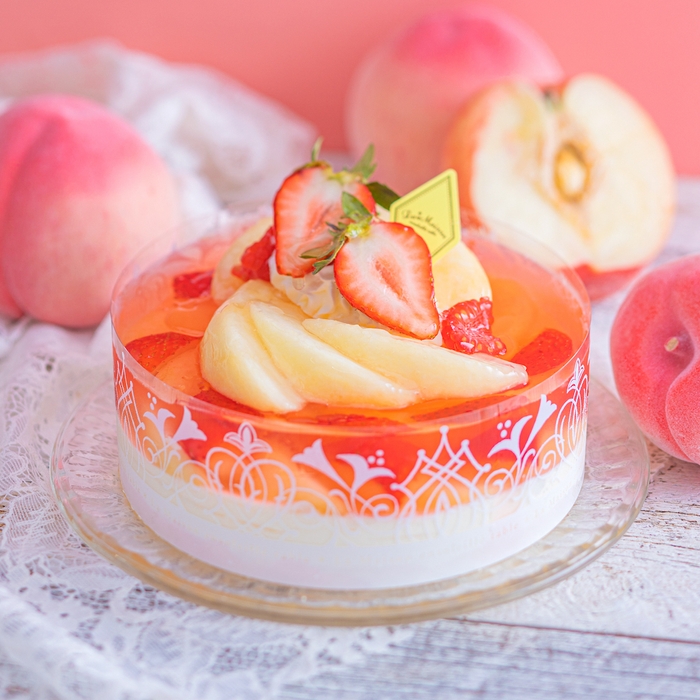 商品詳細:なめらかなフロマージュムースに白桃といちごをジュレにとじ込め、旬のみずみずしい白桃を華やかに飾りました。