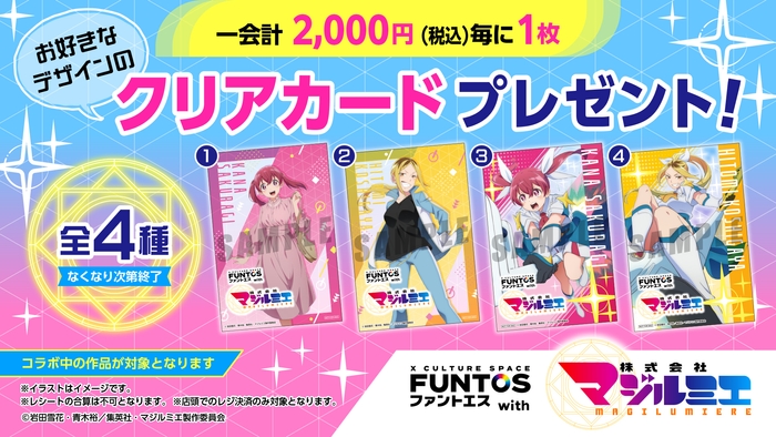カフェ・グッズコーナーにて一会計2,000円(税込)毎に1枚、お好きなデザインのクリアカード(全4種)を1枚プレゼントいたします。