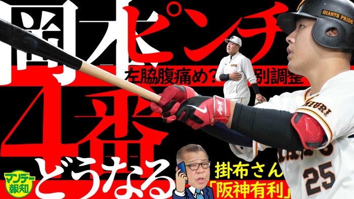 今週のマンデー報知では、スポーツ報知評論家の掛布雅之さんが電話出演し、CSの行方を占ってくれました。自らのバットで1985年に阪神を日本一へ導いたミスタータイガースは、「初戦を落としたら負ける覚悟で」と短期決戦の心得を説明。岡本選手については「脇腹を痛めるとバットを振れない」と心配し、気遣いました。番組MCの加藤&水井デスクも、突然の事態に不安げな表情。主砲不在という最悪のケースも想定した3人が、仮定の話として「代役4番」に選んだ選手とは?