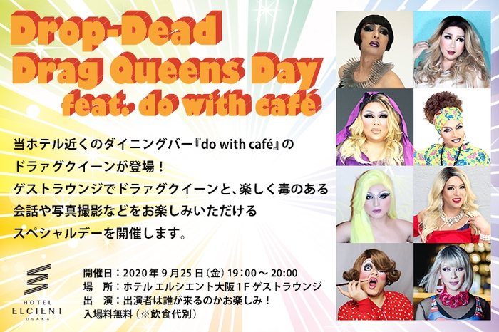 ゲストをもてなすのはホテル近くにあるダイニングバー「do with cafe」の個性たっぷりドラァグクイーン2名。ゲストラウンジで食事をしながら、写真撮影や毒のある会話を楽しみませんか?どなたでも入場料無料でご参加いただけますので、ドラァグクイーンとお話ししてみたいという方や、ディープな大阪を楽しみたいという方などぜひお越しください。