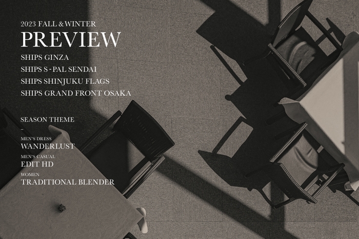 株式会社シップス(本社:東京都中央区、代表取締役社長:三浦義哲)は、2023 FALL & WINTERの立ち上がりを迎えるにあたり、SHIPS 銀座店・エスパル仙台店・新宿フラッグス店・グランフロント大阪店にて、秋冬シーズンのメンズ&ウィメンズの最新アイテムをいち早くご覧いただける“SHIPS 2023 FALL & WINTER PREVIEW”を開催いたします。