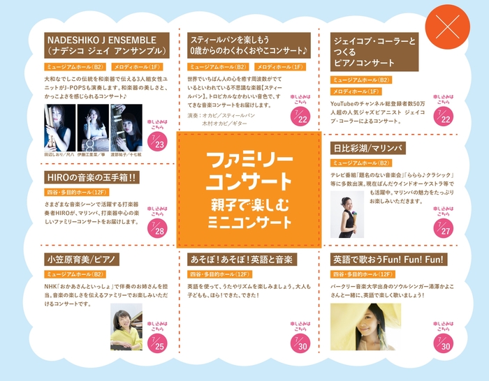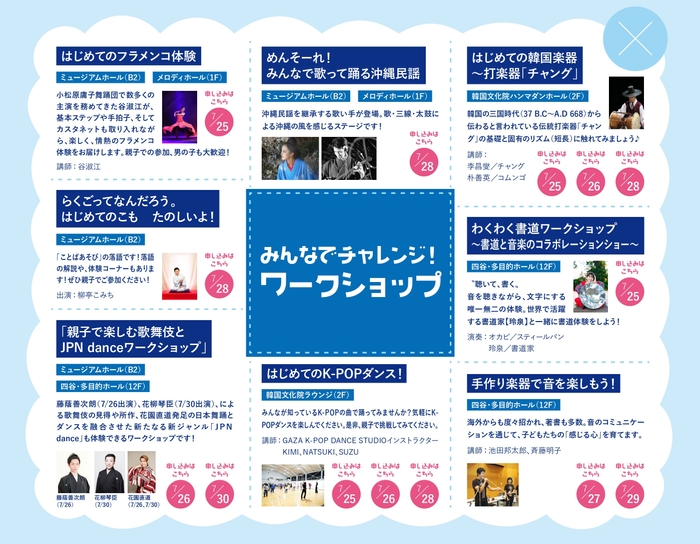 入場無料にて、「子どものための世界民族楽器展」をはじめ、世界の楽器の音色を楽しめるコンサートから、各種ワークショップ、子どものためのスペシャルコンサートなど、多彩なイベントを開催します。