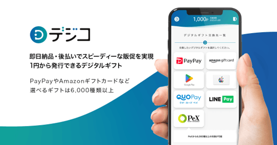 「デジコ」( https://digi-co.net/)は、初期費用・月額費用無料で、PayPayやAmazonギフトカード、Apple Gift Card、Google Play ギフトコード、QUOカードPay、LINE Pay、PeXポイントギフトなどに交換可能なデジタルギフトを、1円単位1枚から当日発行することができるサービスです。いつでもすぐに必要な分だけ発行することができるため、企業の広告予算の調整や急なキャンペーンの実施などにも柔軟に対応することができ、当日まで人数把握が難しいイベントの謝礼などにも幅広く活用することが可能です。