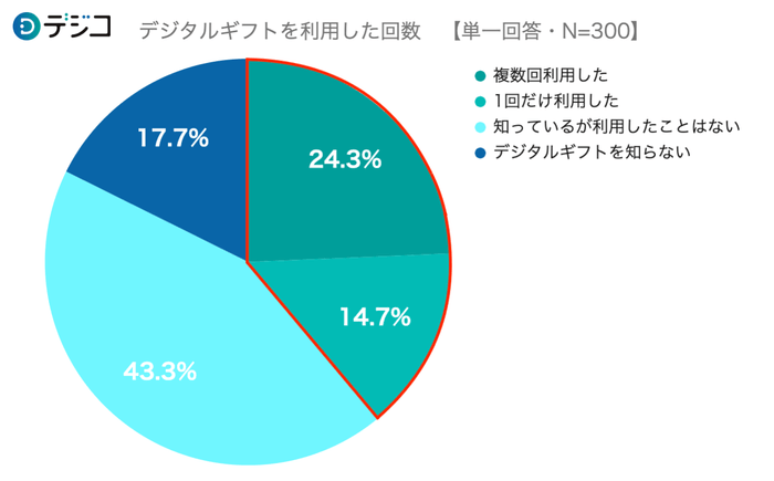 しかし、デジタルギフトを利用したという回答は半数以下の39.0%。43.3%の人はデジタルギフトを知ってはいるものの、利用したことはないと回答しました。
