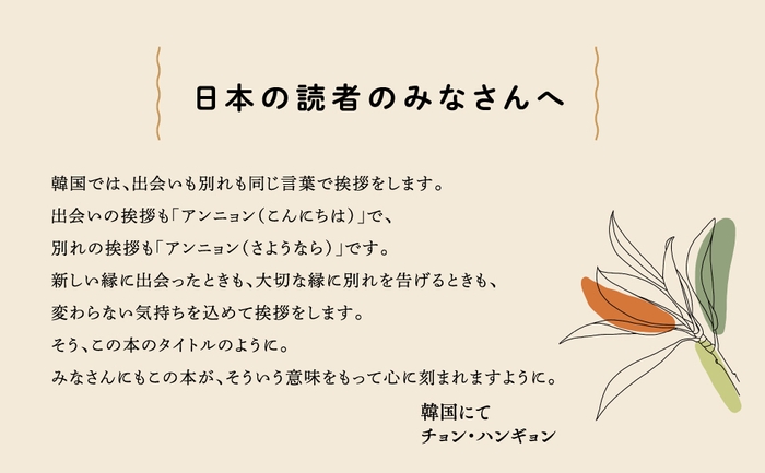 タイトルの「アンニョン」は、韓国語で出会いにも別れにも使う言葉です。その言葉どおり、本書は出会いの喜びや大切な人と共にある幸せにはじまり、最後に別れの章で締めくくります。