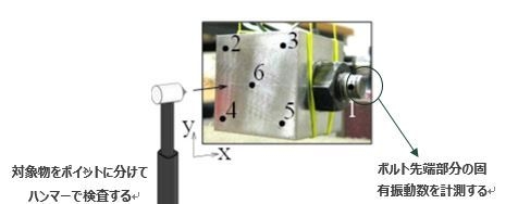 今回の測定方法では、対象物を叩いて軸力に対するボルト先端部の固有振動数の変化を調べることで、軸力を評価します。