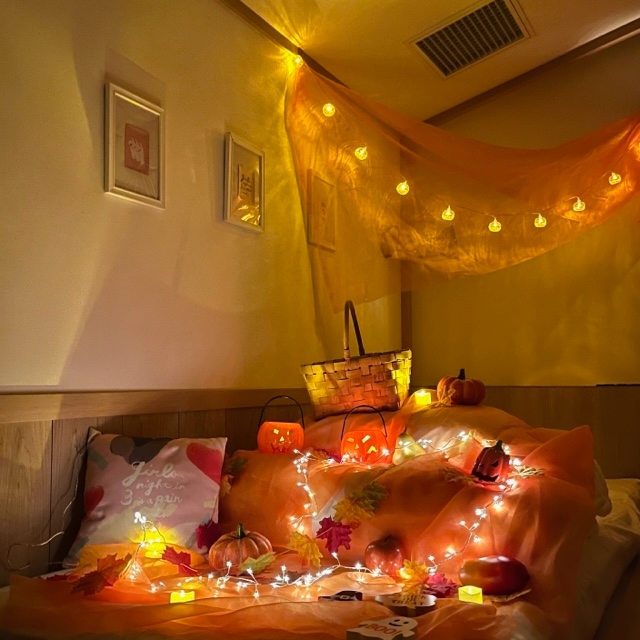 今年のお部屋はたくさんのかぼちゃがお客様をお出迎えする「かぼちゃルーム」。部屋に入ると、かぼちゃをイメージしたオレンジと黒の雰囲気に包まれて一気にハロウィン気分に。壁に貼られたオシャレなポストカードのインテリアで写真映えも間違いなし!部屋の電気を消してイルミネーションライトを点ければさらにハロウィンの夜の雰囲気を楽しめます♡