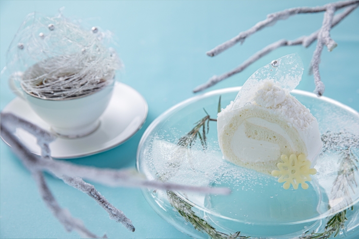 霧氷テラスでは、山々の木々に広がる霧氷の景色を表現したオリジナルの「霧氷カクテル」を提供します。これは、生クリームとブルボンバニラが入ったホワイトチョコレートリキュールに「トマム牛乳」(*2)を合わせたホットカクテルです。雪の結晶をモチーフにしたホワイトチョコレートを溶かして飲みます。とろけるような滑らかな口当たりと甘さが特徴です。また、霧氷テラスオリジナルスイーツの「霧氷ロールケーキ」を提供します。このロールケーキは、霧氷のついた雪景色をイメージしたスイーツです。飴細工やアラザン、ココナッツパウダーなどを使い霧氷のきらめきを表現しています。霧氷をモチーフにしたカクテルやスイーツを楽しみながら雪山の絶景を眺めるのがおすすめです。