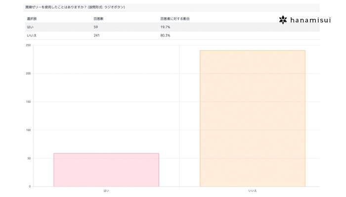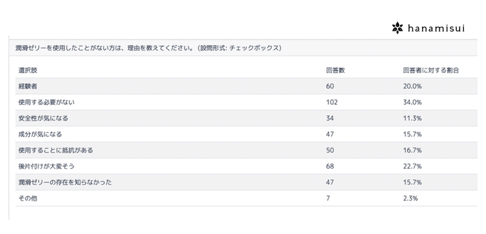 潤滑ゼリーは一般的にどれくらいの方が使用しているのでしょうか?ハナミスイは独自でアンケートを実施して、潤滑ゼリーについての調査を行いました。その結果、潤滑ゼリーを使用したことがある方は、全体の19.7%、300名中59名しか使ったことがないアイテムだということが分かりました。
