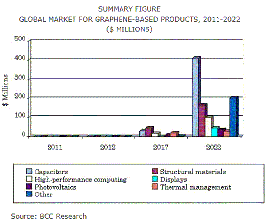 BCCリサーチ社によりますと、グラフェンを用いた製品は2017年に1.229億ドルに、2022年には51.7%の年平均成長率(CAGR)にて9.867億ドルに達すると予測されております。