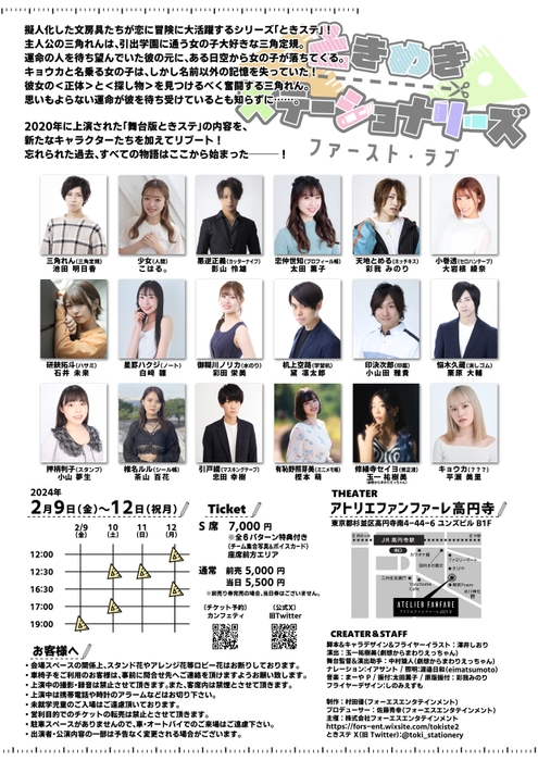 株式会社フォーエスエンタテインメント主催、ときめきステーショナリーズ『ファースト・ラブ』が2024年2月9日 (金) ~2024年2月12日 (月・祝)にアトリエファンファーレ高円寺(東京都杉並区高円寺南4-44-6)にて上演されます。