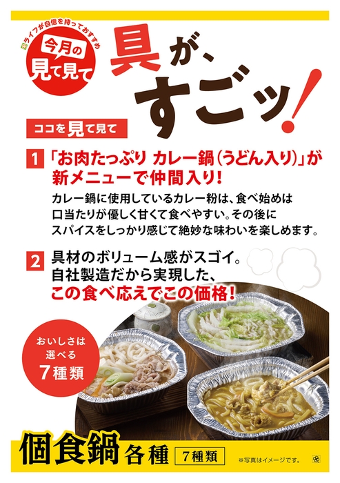 ライフが自信を持っておすすめする「今月の見て見て」の10月商品に選ばれた「個食鍋」シリーズは、ワンコインでお鍋の〆まで楽しめる、カット済みのお肉と国産野菜が入った一人鍋におすすめのライフオリジナル鍋セットです。材料をそろえる手間がなく後片付けも楽々で、昨年度はシリーズ累計68万個を売り上げ、大変ご好評をいただきました。今年度は、新商品としてオリジナルブレンドのカレー粉を使用した「お肉たっぷりカレー鍋(うどん入り)」がラインナップに加わりました。