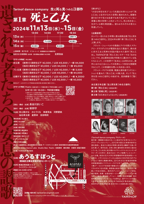 Tarinof dance company本公演「生と死を見つめる3部作 第1章『死と乙女』」が2024年11月13日 (水) 〜 2024年11月15日 (金)にあうるすぽっと[豊島区立舞台芸術交流センター](東京都豊島区東池袋 4-5-2)にて上演されます。