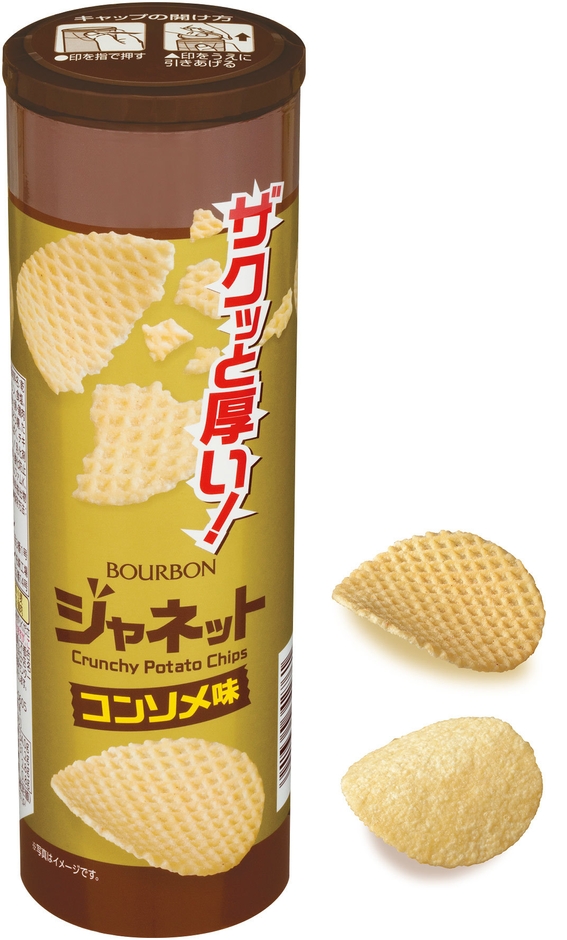 「ジャネット」は、厚みのある生地の表面に網目状の加工を施すことで、ザクッとした堅い噛み応えを保ちながらも、口の中でほどけていく新食感の成型ポテトチップスです。生地が厚く、ポテトの風味をしっかり感じられることに加え、これまでの成型ポテトチップスとは異なるザクザクとした食感をお楽しみいただけます。シンプルなしお味とパンチのあるコンソメ味を展開し、スナック市場の活性化を図ってまいります。