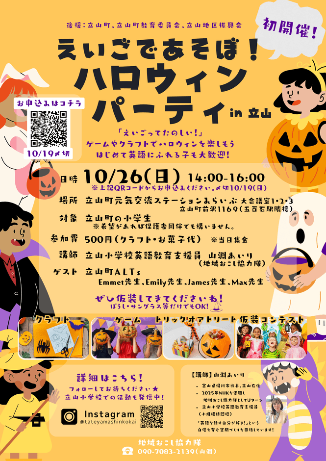 株式会社陽咲玲は、立山町で活動する地域おこし協力隊の山淵あいりが、立山町の小学生を対象に「英語に楽しくふれられる機会を立山の子どもたちに提供する」ことを目的に10月26日(日)にハロウィンイベントを開催することをお知らせします。
