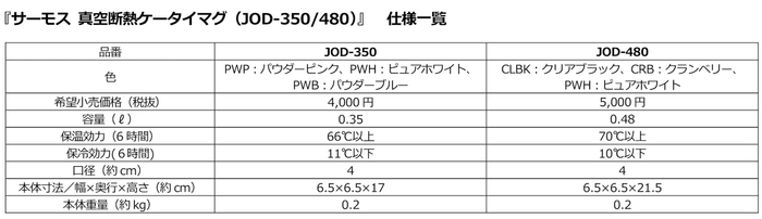 魔法びんのグローバル企業として、人と社会に快適で環境にもやさしいライフスタイルを提案するサーモス株式会社(本社:東京都港区 社長:中條啓一郎)は、軽量・シンプルデザインで人気のスクリュータイプのケータイマグより新モデル『サーモス 真空断熱ケータイマグ(JOD-350/480)』を2020年10月1日(木)※ より発売します。