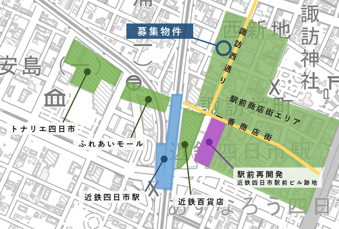 近鉄四日市駅を中心に「四日市一番街商店街」「グリーンモール商店街」「すずらん通り商店街」「表参道スワマエ商店街」など多数の商店街が交わっています。「近鉄百貨店」や「トナリエ四日市」など大規模商業施設も立ち並ぶことから、若年層・ブルーカラー就業者、高齢者まで幅広い層が集う県内随一の繁華街として知られており、毎年8月には大四日市まつりも開催しています。