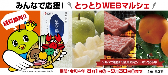 新型コロナウイルス感染拡大により県内外での販売の制約が続く中、県内事業者の厳しい経営状況を踏まえ、県産品の販路拡大を目的に、県産品を広く取り扱う一般社団法人物産協会と連携し、鳥取県代表する二十世紀梨など産直商品を揃えた鳥取県産品WEBマルシェを開催します。