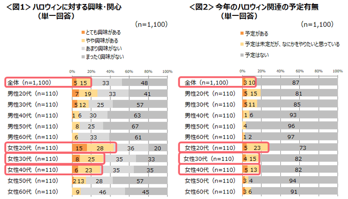 性年代別に見ると、女性の20~40代は比較的ハロウィンへの興味・関心が高く、今年のハロウィン関連で予定がある、あるいは予定は未定だが、なにかをやりたいと思っている人も多い。<図1・図2>