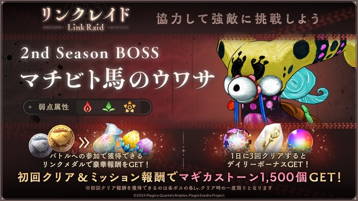 初回クリア&ミッション報酬でマギカストーンを最大1,500個獲得いただける他、BOSS討伐やバトル結果による貢献度で獲得可能な「リンクメダル」で豪華報酬と交換いただけます。