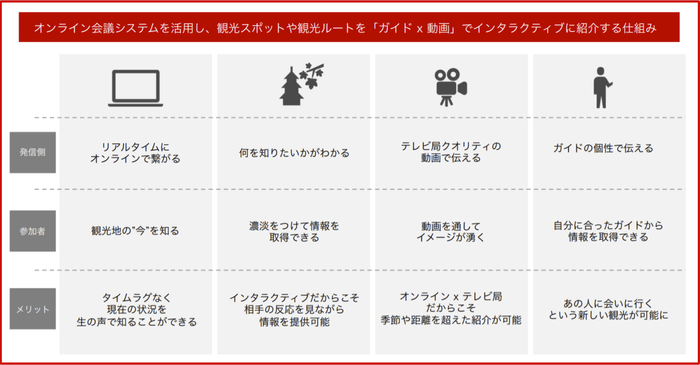 OTTは、地方のテレビ局を中心とした動画のプロたちが撮影した動画を活用し、地元の観光ガイドや地元をこよなく愛する人が、地元ならではの目線でオンラインガイドを行うことで、「観光地への憧れ」や「実際にそこに行きたい」「その人に会いたい」という願望を醸成するプロモーション手法です。