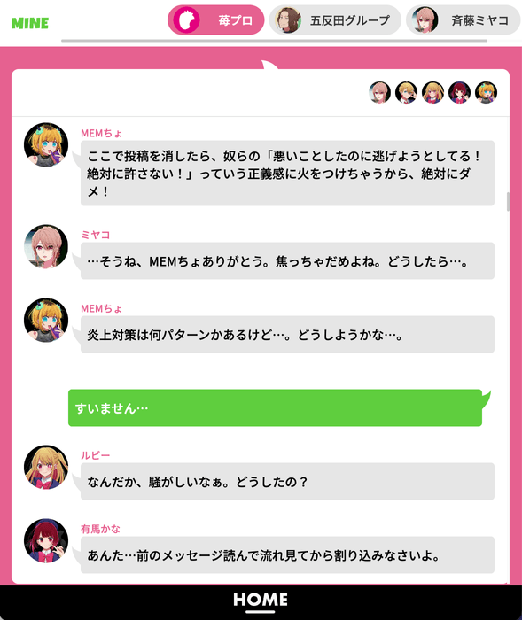 プレイヤーは苺プロ所属の俳優になりきって出演作の台本の読み合わせをしたり、アクアやB小町とグループチャットでやりとりしたりと、【推しの子】の世界の中で仲間たちと協力して芸能界に立ち向かいます。