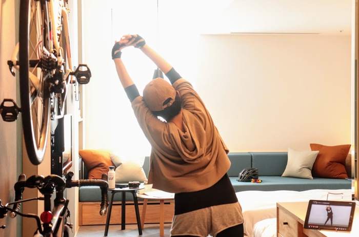 パブリックスペースは、自転車を持って移動しやすい、ゆとりある設計。滞在中、いつでも自由に利用できる整備コーナー「サイクルスペース」もあります。サイクリストが集まるので情報交換の場としても最適!工具の貸し出しも行っているので手ぶらでお越しいただけます。また、片時も自転車と離れたくない人には「サイクルルーム」がおすすめ!客室に自転車を持ち込めるだけでなく、サイクルルームに泊まった人だけがレンタルできる滞在着や、愛車(自転車)と添い寝するための寝具セットもあるので、自転車への愛が止まらない人はぜひ!