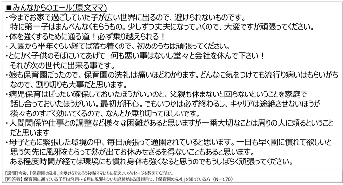 「ママもお子さんも悪くない!」「必ず乗り切れる!」「パパと事前に話し合っておくことが大事」というようにエールから事前対策まで多くの声が寄せられた。(下記一部抜粋)