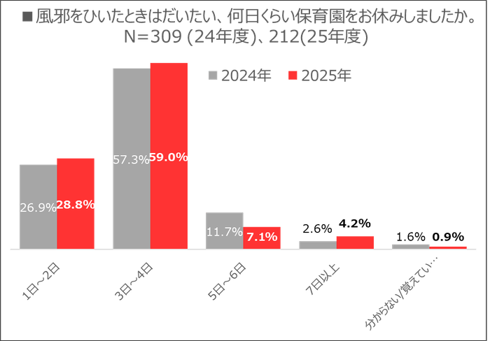 このような保育園に通い始めたお子様が、風邪などの感染症にかかる現象は「保育園の洗礼」と言われている。この「保育園の洗礼」という言葉の認知率も高まっており、今回の調査では保育園に通わせる親の約8割が「保育園の洗礼」というワードを、さらに45%の方が内容まで把握しているという結果となった。また昨年に引き続き、お子様が風邪をひくと3~4日休ませた方が最も多いということがわかった。