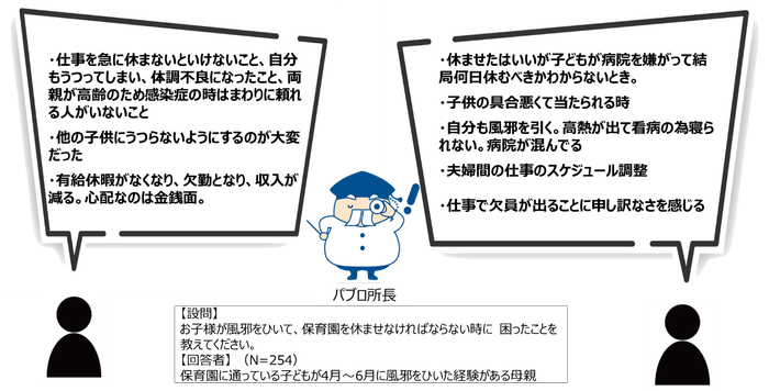 お子様を保育園に預けられないと「親も仕事を休まないといけない」、「(働けないと)収入面が心配」、「他の子供にうつさないようにするのが大変」、「夫婦間のスケジュール調整が大変」など,多くの困りごとが寄せられました。(一部抜粋)